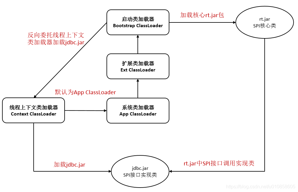 首先 java. sql. DriverManager 是由启动类加载器加载的,创建真正的 Dirver 对象时需要使用到 mysql 提供的实现:com. mysql. jdbc. Dirver,即要初始化该类。但是启动类加载器加载 DirverManager 的时候,使用到了启动类加载器无法加载的类,这时候就需要由系统类加载器来加载。com. mysql. jdbc. Dirver 通常放在类路径下的(其实不一定)。到这里和线程上下文类加载器没由任何关系。在 DriverManager 中使用系统类加载的时候,可以直接使用静态方法 ClassLoader. getSystemClassLoader (),但是这种情况的前提是 com. mysql. jdbc. Dirver 类在类路径下。如果不在类路径下,而且在系统环境中有其他的类加载器,在通过其他类加载器可能出现无法正确加载扩展点的情况。比如某个类的字节码是在数据库中存储,这时我们需要自定义一个类加载器去加载它,这个类加载器会告诉 DriverManager 去我们指定放的地方取。因此 Thread. currentThread (). setContextClassLoader (自定义加载器/默认是系统类加载器); 这个就是线程上下文类加载器起到的介质作用。线程上下文中默认放的是系统类加载器。